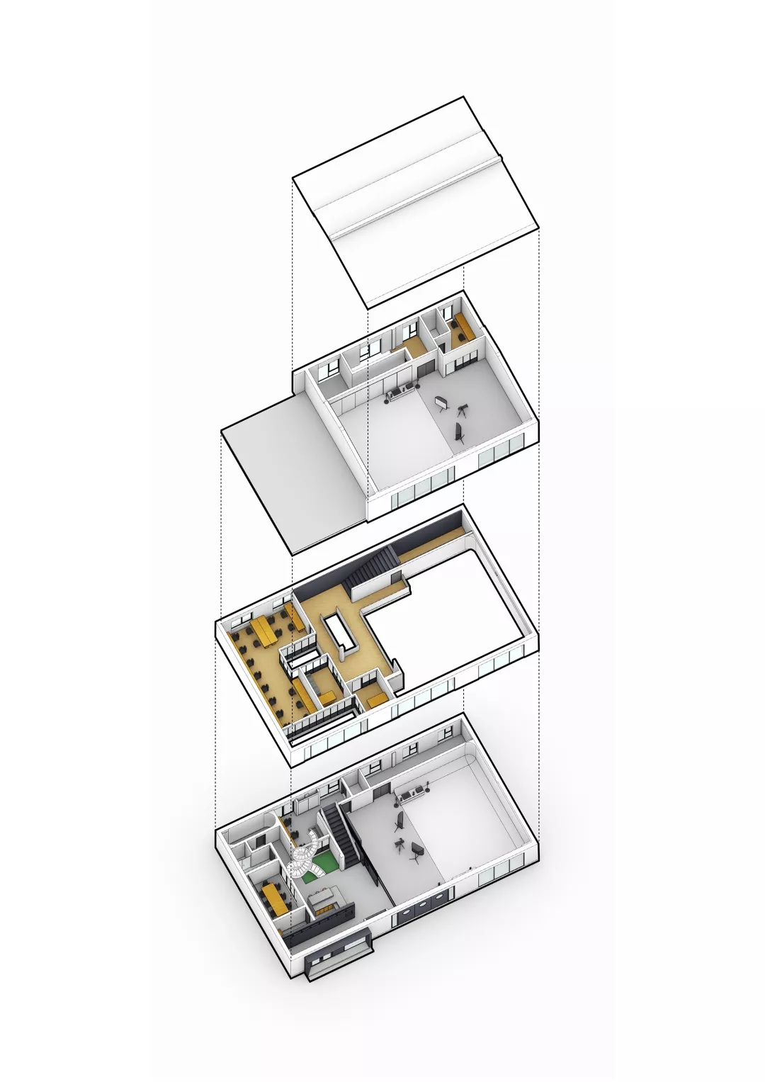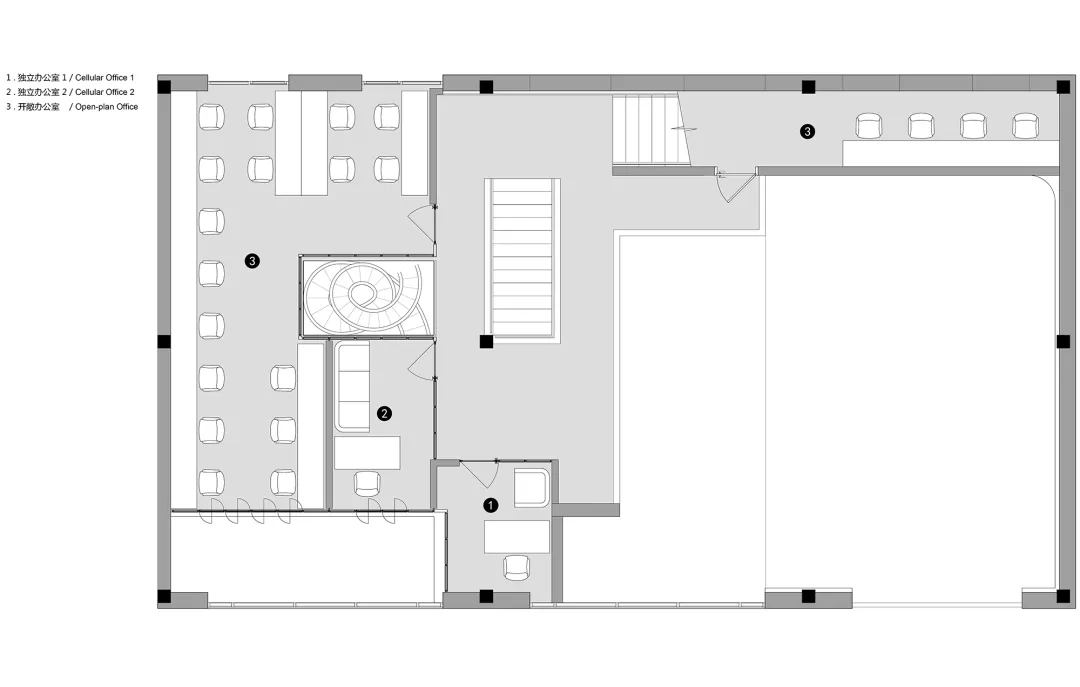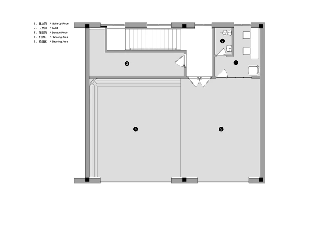 ASTUDIO攝影工作室是一個(gè)多功能的復(fù)合空間,UUA把拍攝、化妝、接待、辦公、會(huì)議、休閑等多種功能有機(jī)地融合在這個(gè)通高的廠房之中,空間緊湊又富于變化。拍攝區(qū)為最重要的功能單元,由于需要足夠的長(zhǎng)寬高空間來(lái)滿足設(shè)置無(wú)影墻、布景布光以及拍攝距離等需求,所以設(shè)計(jì)師將一層的一半劃歸為1號(hào)拍攝區(qū),保留雙層通高的空間形式;另一半則加建出雙層空間,其中一層作為接待,二層作為辦公。廠房的三層因?yàn)樵揪哂凶銐虻膶痈?,因此被設(shè)置為2號(hào)拍攝區(qū)。