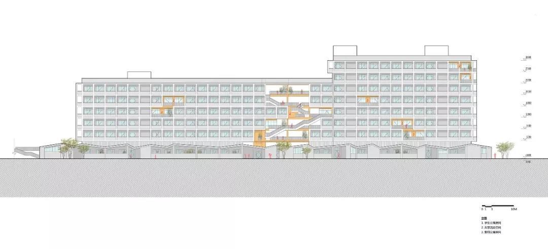整個(gè)學(xué)校的概念策略、空間形態(tài)和場(chǎng)所定義描繪了一副全新生動(dòng)的體驗(yàn)式教學(xué)圖景,設(shè)計(jì)作為實(shí)現(xiàn)的媒介為義烏新世紀(jì)外國(guó)語(yǔ)學(xué)校的師生提供了更多的教育體驗(yàn)和可能性。而貫穿其中的設(shè)計(jì)聚焦點(diǎn):教育類空間在城市高密度環(huán)境中的微妙立場(chǎng)、國(guó)際化教學(xué)體系與傳統(tǒng)國(guó)學(xué)文化兼容并重的有機(jī)教學(xué)空間建筑空間、面向未來(lái)的傳統(tǒng)空間體驗(yàn)營(yíng)造,也是飛速城市化進(jìn)程中的中國(guó)所普遍面臨的問(wèn)題,更是零壹城市一直以來(lái)并且會(huì)持續(xù)關(guān)注的高密度城市與教育空間問(wèn)題的研究點(diǎn)。
