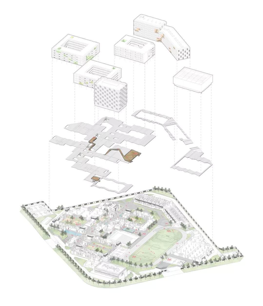 此外,設(shè)計(jì)在教室與地面集中活動(dòng)場(chǎng)地之間創(chuàng)造了中間層級(jí)的活動(dòng)場(chǎng)地,讓課間短暫的時(shí)間也能讓學(xué)生充分玩耍。把教學(xué)樓和宿舍樓局部的體塊掏空形成半開(kāi)放的活動(dòng)空間,將掏空與開(kāi)洞這種二維的建筑元素增加了一維,表面上看是把原有的實(shí)體空間減少了一部分,實(shí)則掏空的部分成為了學(xué)生課外活動(dòng)、接觸自然的場(chǎng)所,增加了整體空間的豐富程度,反而達(dá)到了100-1=101的效果。并且,活動(dòng)空間被設(shè)計(jì)為統(tǒng)一的明黃色,配合午間陽(yáng)光的光影效果,為校園增添活力的同時(shí)增強(qiáng)辨識(shí)度與歸屬感,促進(jìn)學(xué)生們的溝通交流。