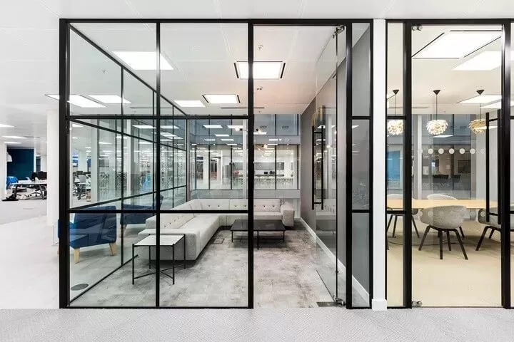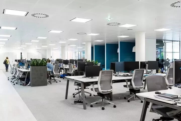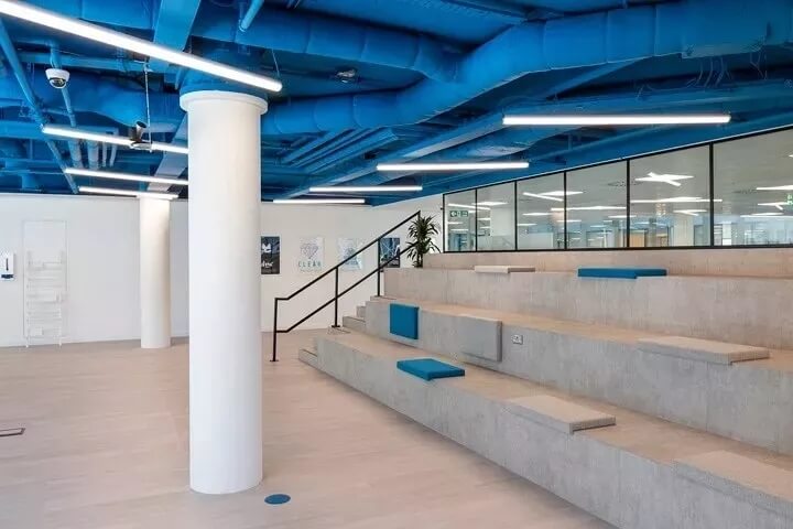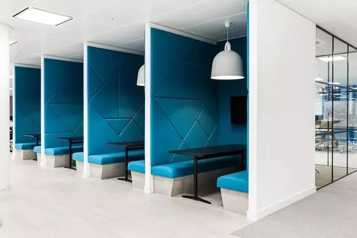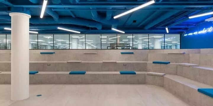 特點:科技,總部、英國、斯堪的納維亞設計風、寧靜自然簡約、灰色、藍色頂面、水泥質(zhì)感、看臺式階梯座、車廂座、玻璃隔斷