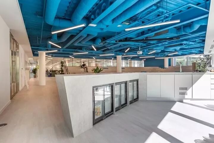 本案最令人贊嘆的創(chuàng)意構思是與接待區(qū)相連的休閑區(qū)的藍色頂面設計,藍色是公司的標識色,除了這里也點綴于會議空間和靈動的工作區(qū)。裸露的頂面和設備管道都統(tǒng)一在純凈的藍色之中。這里不僅用于接待訪客同時也是大型集會、交流協(xié)作和派對活動之地。