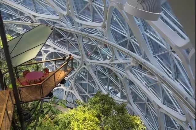 不同類型的開放區(qū)域 亞馬遜全球不動產(chǎn)及設(shè)施副總裁約翰·斯科特勒(John Schoettler)表示, 整座建筑可以同時容納800人。它除了是一個類似公園的空間外,員工們也可以在里面上網(wǎng)充電。