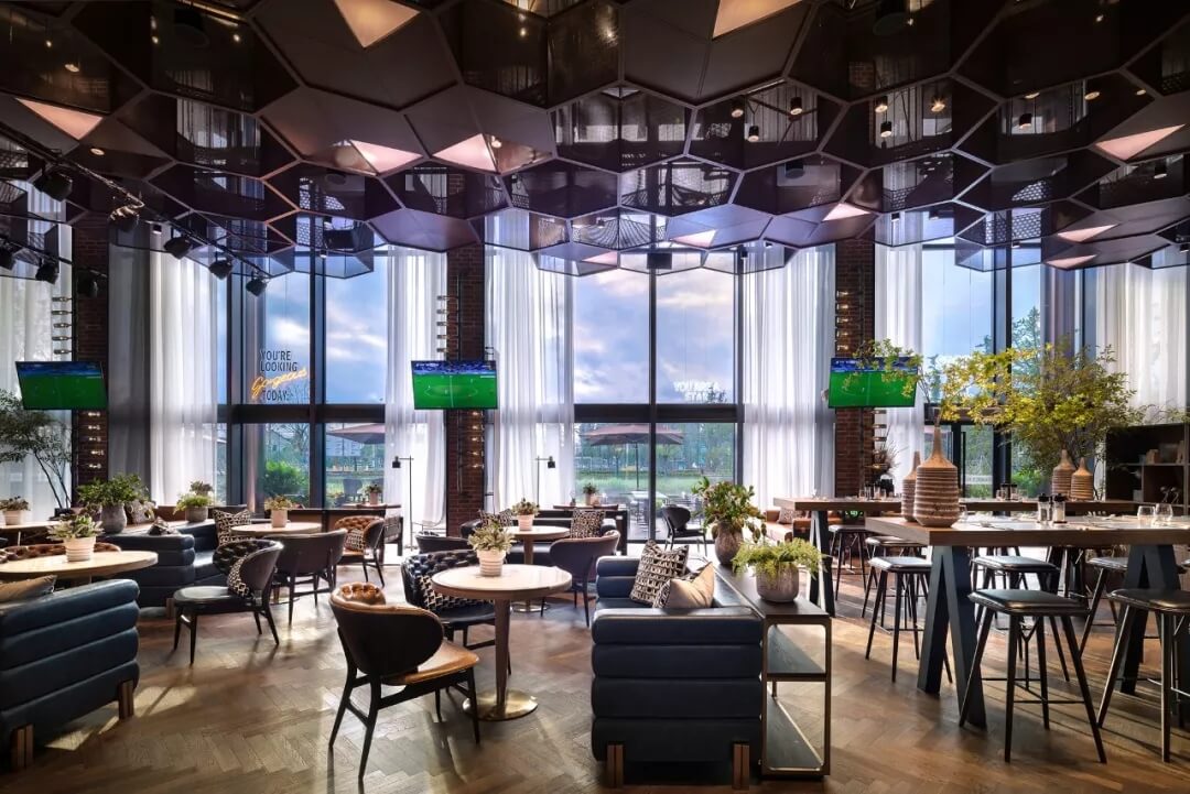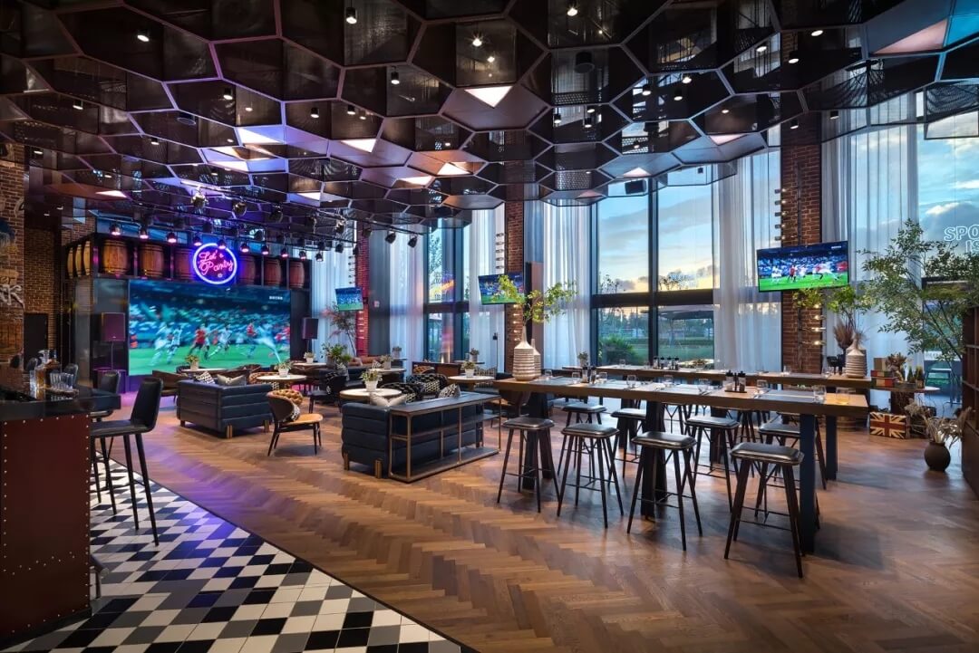 設(shè)計將足球的六邊形化用于天花的裝飾上,立體幾何的體量、金屬線條的質(zhì)感賦予了社交空間的適當(dāng)距離感。多幅大屏幕的配置,讓聚于此的人們,沉浸于啤酒吧和比賽現(xiàn)場的氛圍當(dāng)中,盡情享受在開闊大氣的空間格局中觀摩賽事的自由,為熱愛喝彩,為夢想干杯,傳遞運動不止的精神。