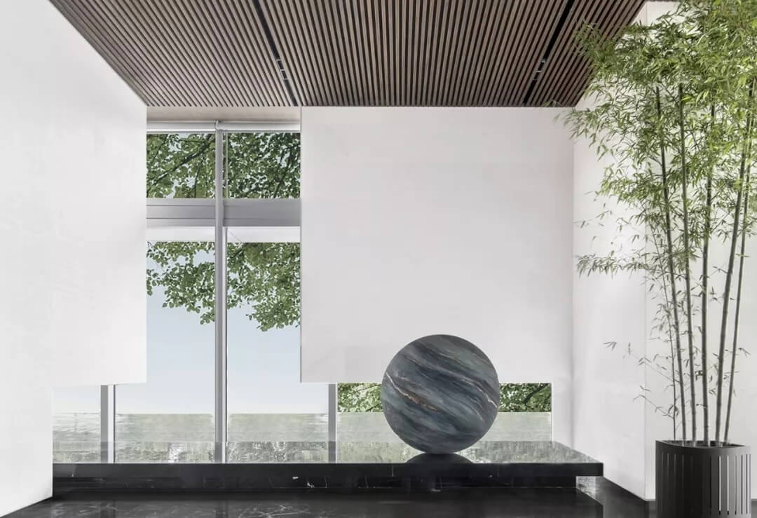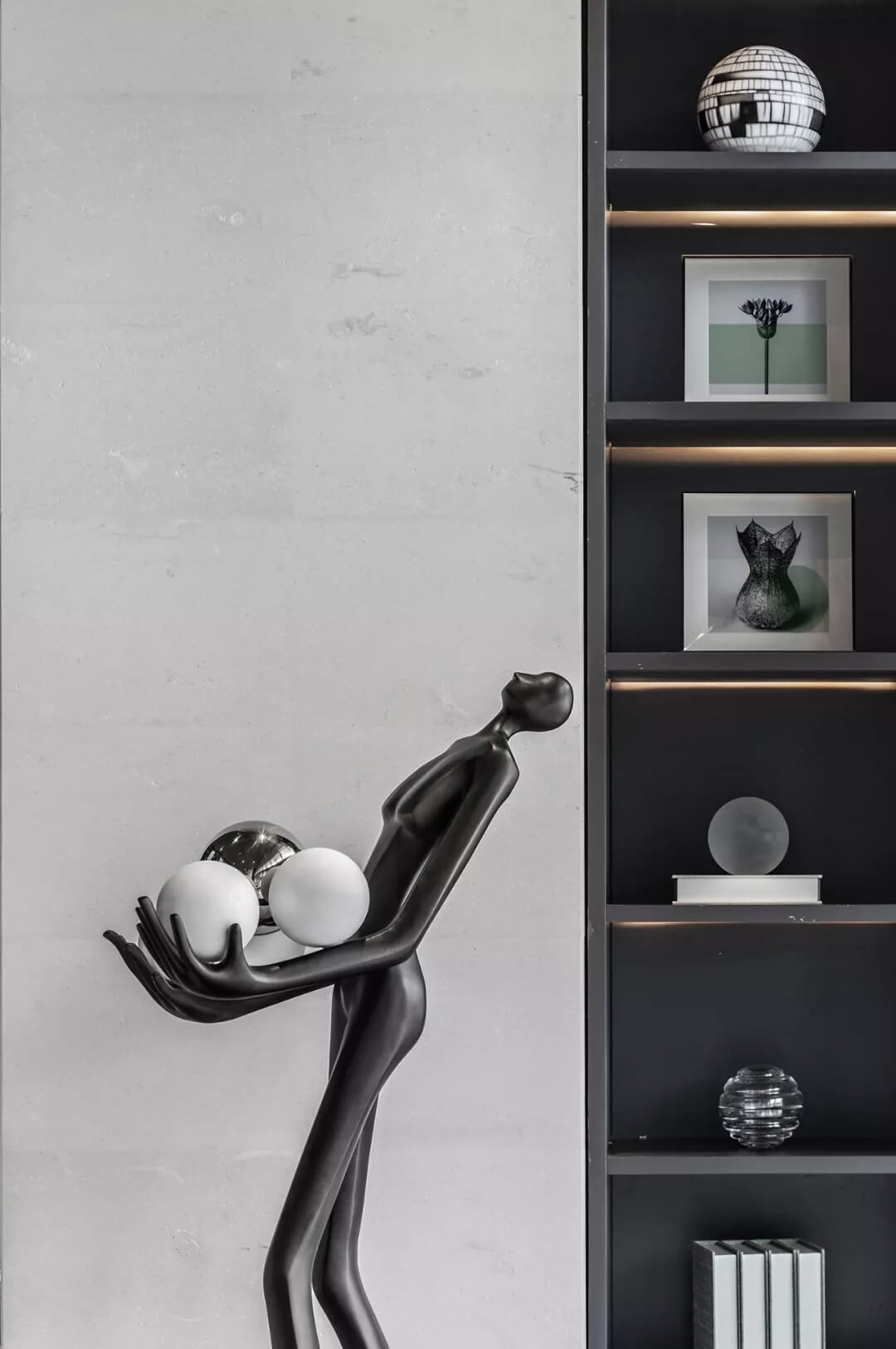 進(jìn)入前廳,暗涌波動(dòng)的猶如海洋的紋理型球狀醒目與空間,設(shè)計(jì)師賦予的撞色又猶如浩瀚星空。以玻璃與室外的相隔,營(yíng)造視覺(jué)的感覺(jué)錯(cuò)覺(jué),仿若一體的空間綿延。