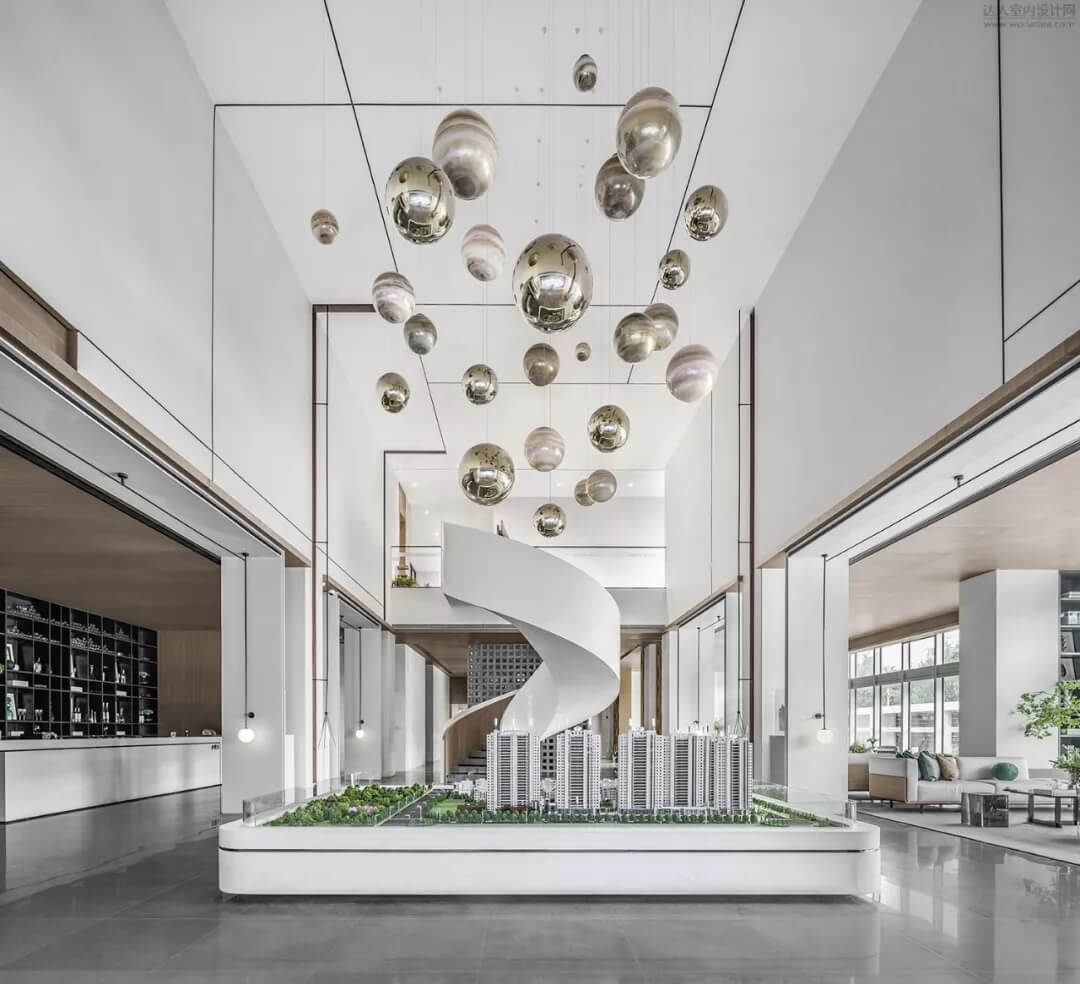 以和諧地球?yàn)槔砟钫归_(kāi)的設(shè)計(jì)元素,售樓處上方錯(cuò)落有致、大小不同的球體精致的點(diǎn)綴著空間,紋理折射光線,以靜止?fàn)顟B(tài)演繹動(dòng)態(tài)。