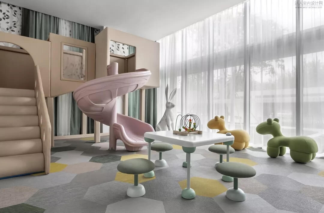 兒童區(qū)曼妙著森林深處的味道,暖暖的顏色彩散發(fā)著與自然 ,生命,和平共處的氣息,玻璃的陽(yáng)光開(kāi)放式結(jié)構(gòu),智慧的精靈無(wú)處不在,響應(yīng)著空間的靈動(dòng)氣息。