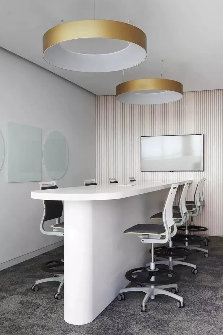 計(jì)概念的靈感來源于公司的名稱——L'or(法語,意為gold金色)和aurele(法語,意為halo光環(huán))。“金色光環(huán)”的品牌寓意成為整個(gè)空間形式的構(gòu)造背景,整個(gè)辦公室的主動(dòng)線也圍繞著一個(gè)圓環(huán)來規(guī)劃。這個(gè)中心圓環(huán)被定義為一個(gè)明亮的核心空間,形成一個(gè)中心會(huì)議大廳,周邊分布著或開放或封閉的會(huì)議區(qū)。