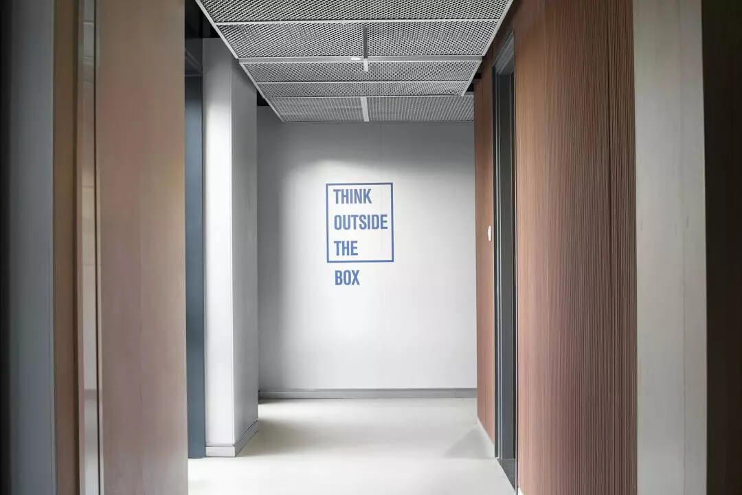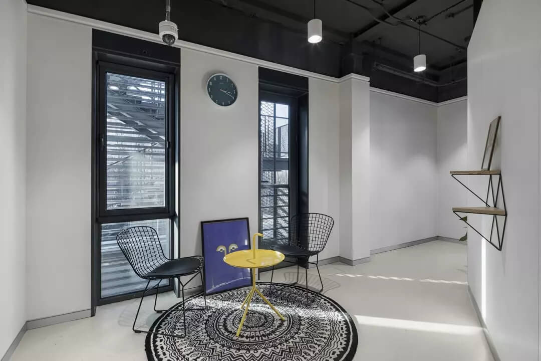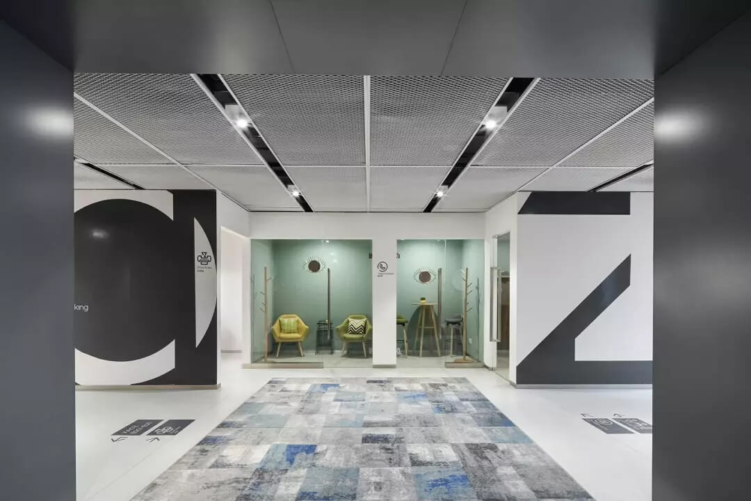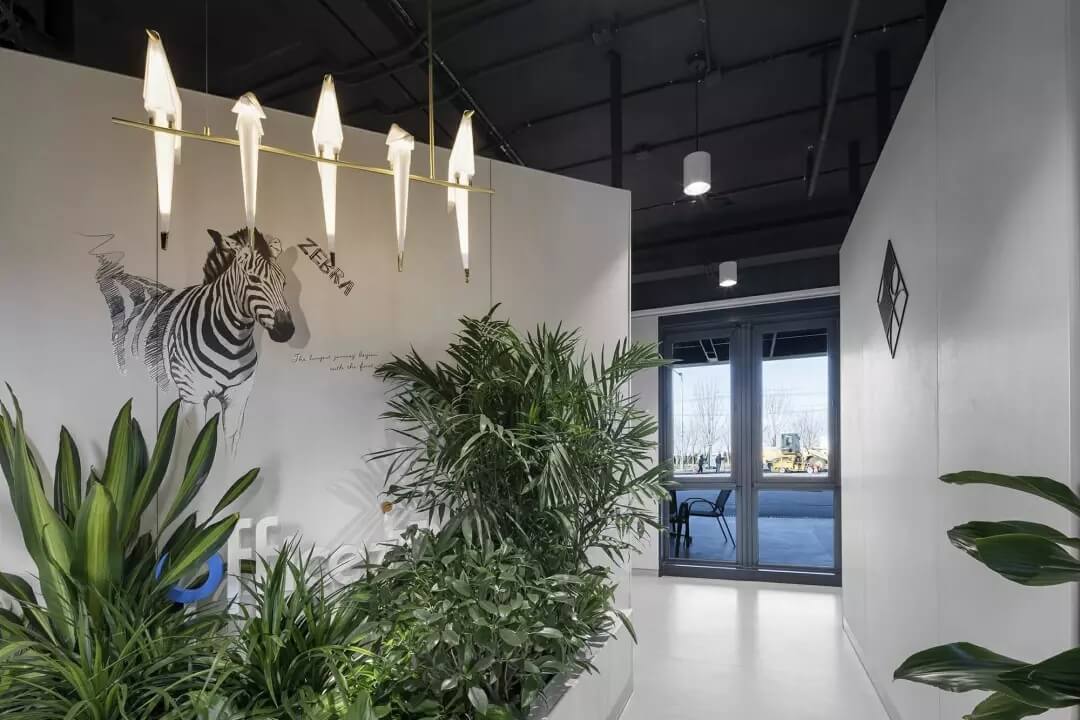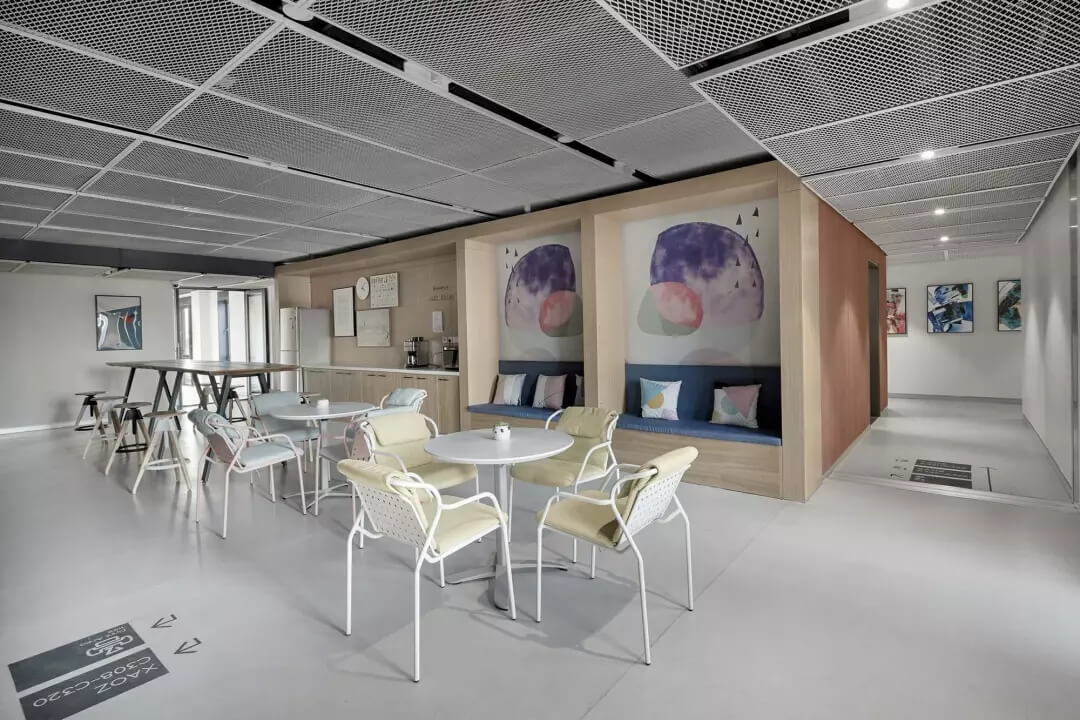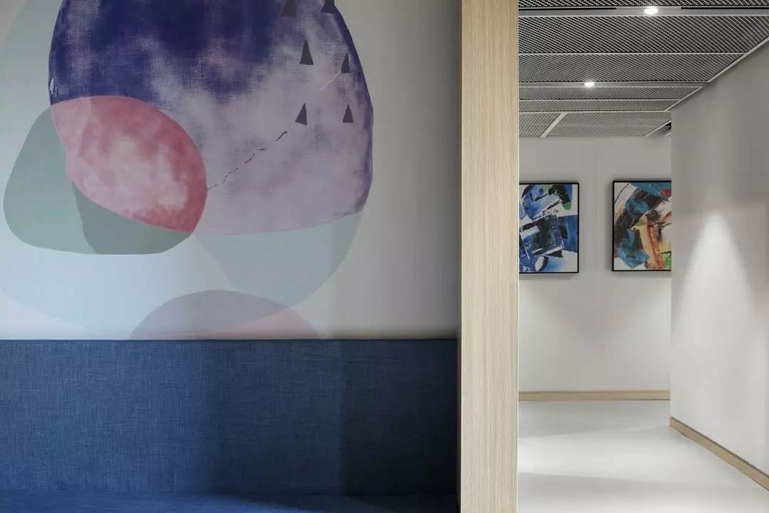 至于盒子以外的空間,我們想凝聚更多的人文藝術(shù)氣息,選擇較多地去鋪陳展示各種抽象的藝術(shù)線條和畫作,同時為了不失去生活氣息,各個角落選擇顏色比較跳躍的家居什物,讓它作為一個流動的戶外廣場,讓人可以自在穿行其中,偶爾停駐觀察,經(jīng)得住人聲鼎沸的喧擾,亦能提供心靈靜憩的安寧。在這里,大家認(rèn)真辦公、生活、盡情交流、分享,它就是一個安放綠意,有極高包容度的公共空間。