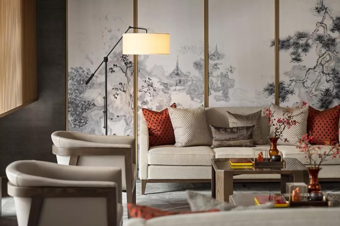 屏風上“高山流水遇知音”,宛如在娓娓道來伯牙子期當年的故事。收藏級裝幀叢書,代表禮儀身份的印章,抱枕上的祥云、山水刺繡,細致精巧的陳設(shè)烘托出文人雅趣,同時營造了沉穩(wěn)靜逸的氛圍,堅定地表達了現(xiàn)代東方的美學態(tài)度。