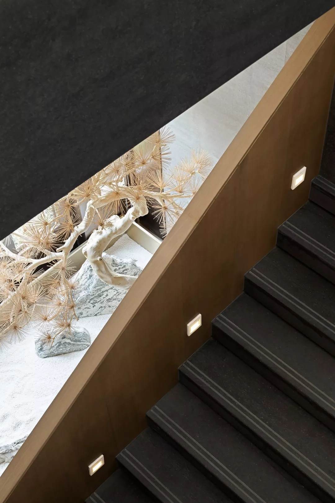 樓梯作為一層和二層VIP室的重要連接,強調(diào)建筑感,在一隅打造景觀顯露禪意,通過木飾面包裹更具整體性,簡潔有序,又釋放古雅風韻。