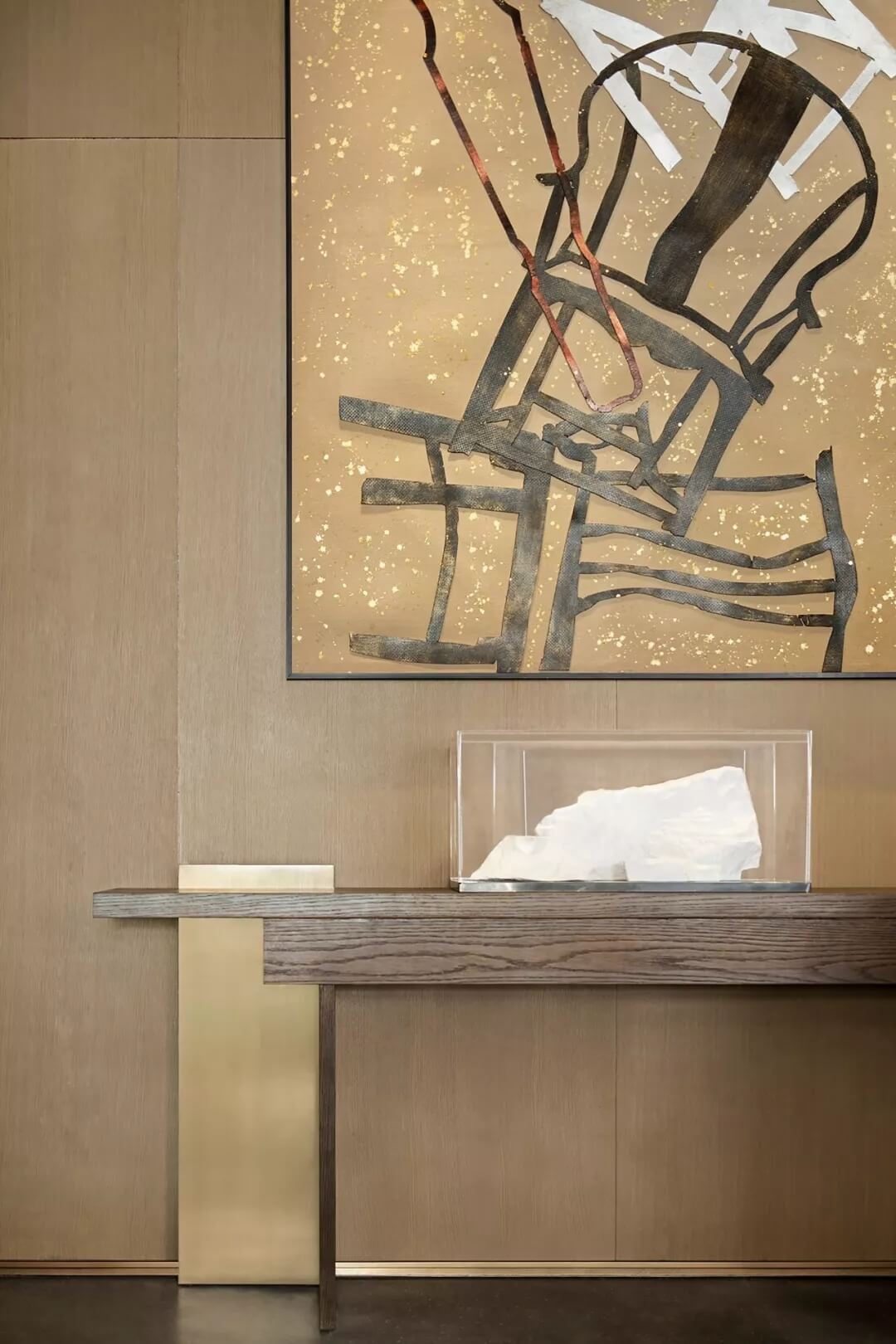 洽談區(qū)另一側(cè)的端景藝術(shù)畫與立面背景融為一體,畫作上由硬紙板雕刻出來的官椅層層疊加,以自由不羈的位置關(guān)系增添趣味。