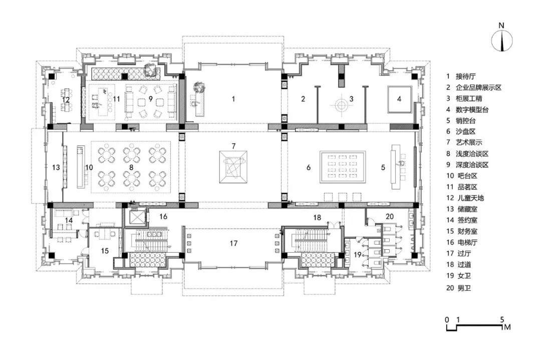 印、屏、紋可謂官宅元素的重要載體,在中國文人的生活中占據(jù)著重要的地位,彰身份,寓雅趣,更是“第”之名的具象化表現(xiàn)。沙盤區(qū)則是這三項元素最有力的映射與例證。木格柵因勢延續(xù)至此,銷控臺主背景及金屬陣列屏風則滿載印章紋案,以純粹統(tǒng)一的手法、元素來塑造其干練有序的風貌。