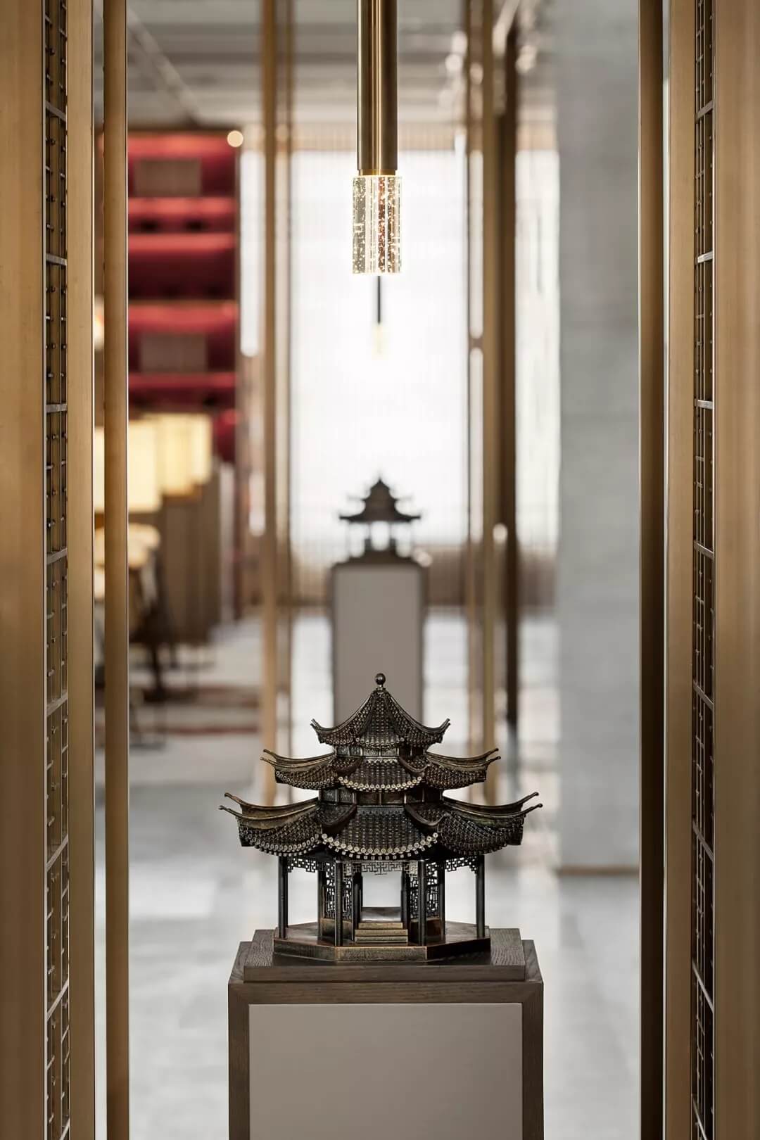 此外,八角亭作為官宅的建筑小品,自然也是不可或缺。設(shè)計師將黃鶴樓前的八角亭植入室內(nèi),運用3D打印技術(shù),表面作特殊的工藝處理,實現(xiàn)古銅金屬材質(zhì)的表達,詮釋出現(xiàn)代與傳統(tǒng)、傳承與發(fā)展的融合。