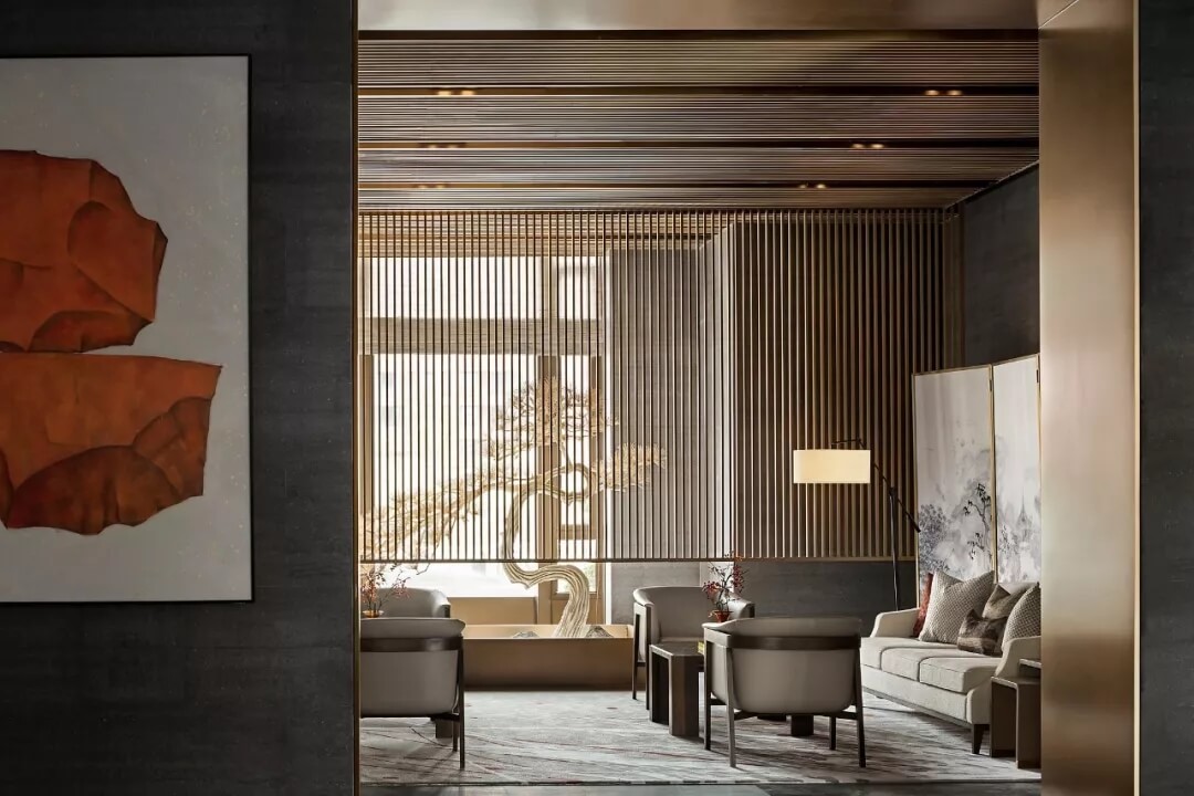 接待臺后方屏風采用香檳金木飾面打底,以浮雕般的技法將顏料手工涂抹之上,勾勒出亭臺樓閣、門坊巷院、宅第集群。臺面上的橘紅插花,講究枝葉的旁逸斜出,保留線條美與自然美,平添了一種沉靜之氣,將東方之意引入更悠遠的境地。