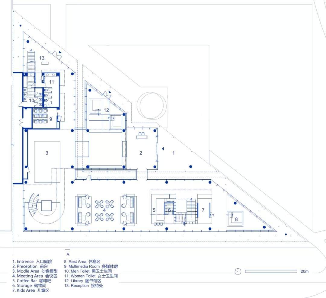 同時(shí),整個(gè)建筑運(yùn)用了現(xiàn)代構(gòu)圖的方式,突破了傳統(tǒng)對(duì)稱(chēng)的客家建筑特征,將多個(gè)同心半圓演化成多個(gè)相似三角形,構(gòu)成了不對(duì)稱(chēng)的幾何空間;巧妙地通過(guò)線與面的緩急對(duì)比加強(qiáng)了視覺(jué)上的層次感,以不同的設(shè)計(jì)手法,在保持建筑與外部交匯貫通的關(guān)系的同時(shí),強(qiáng)化了建筑的縱深感。