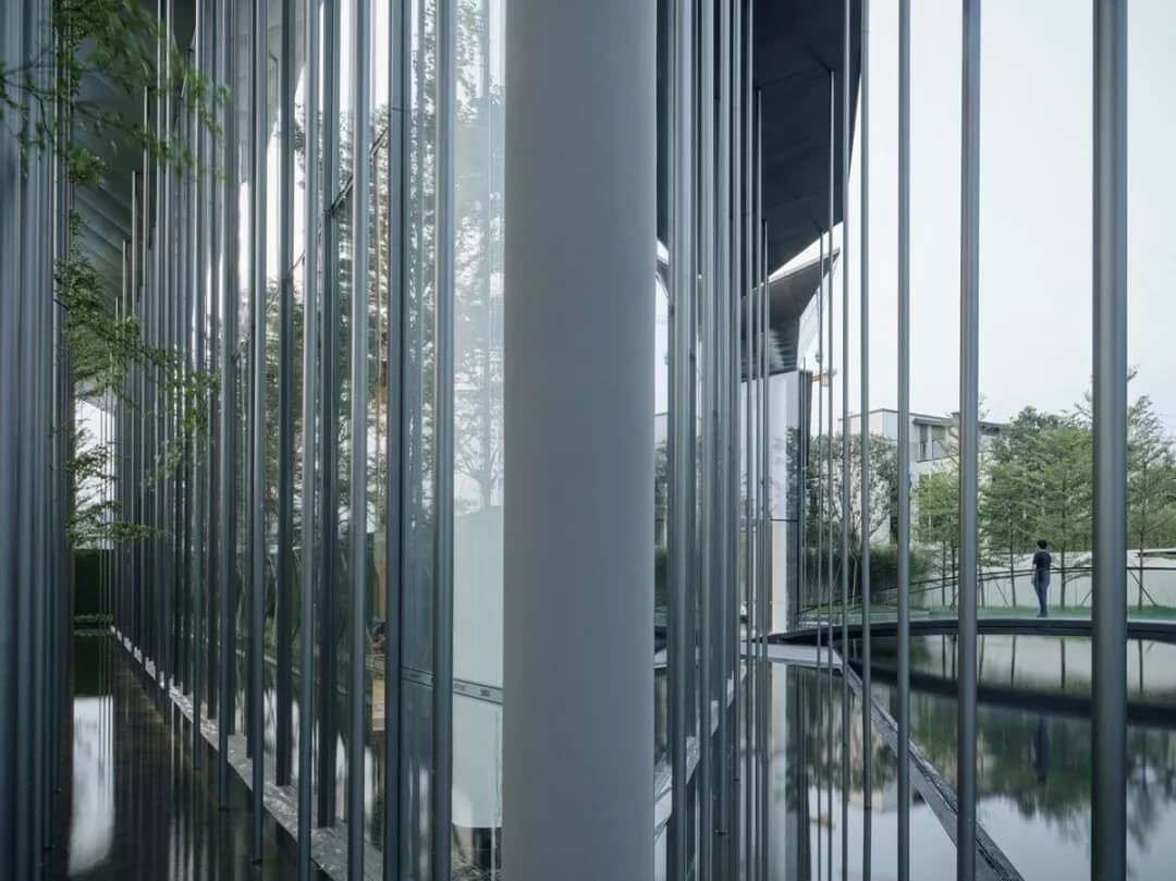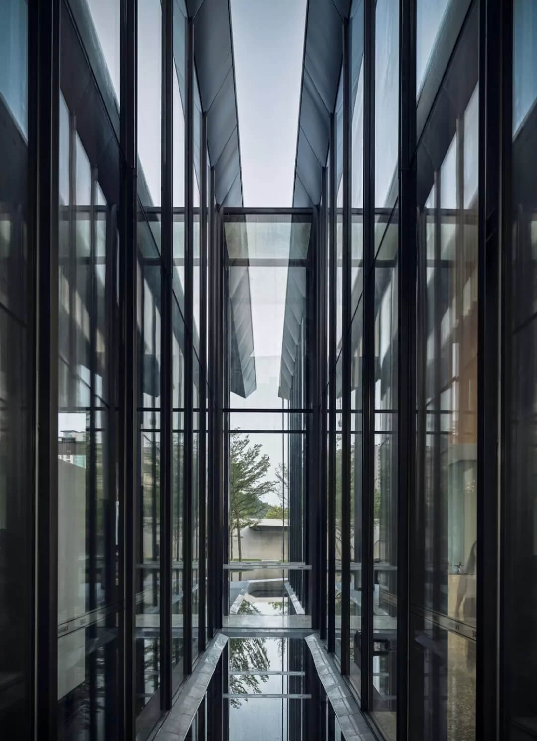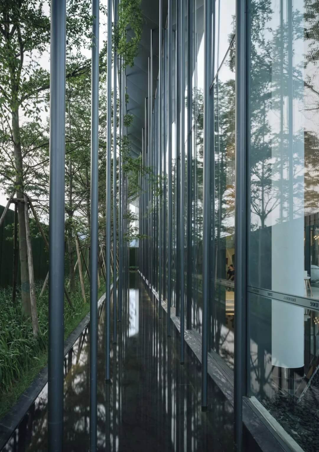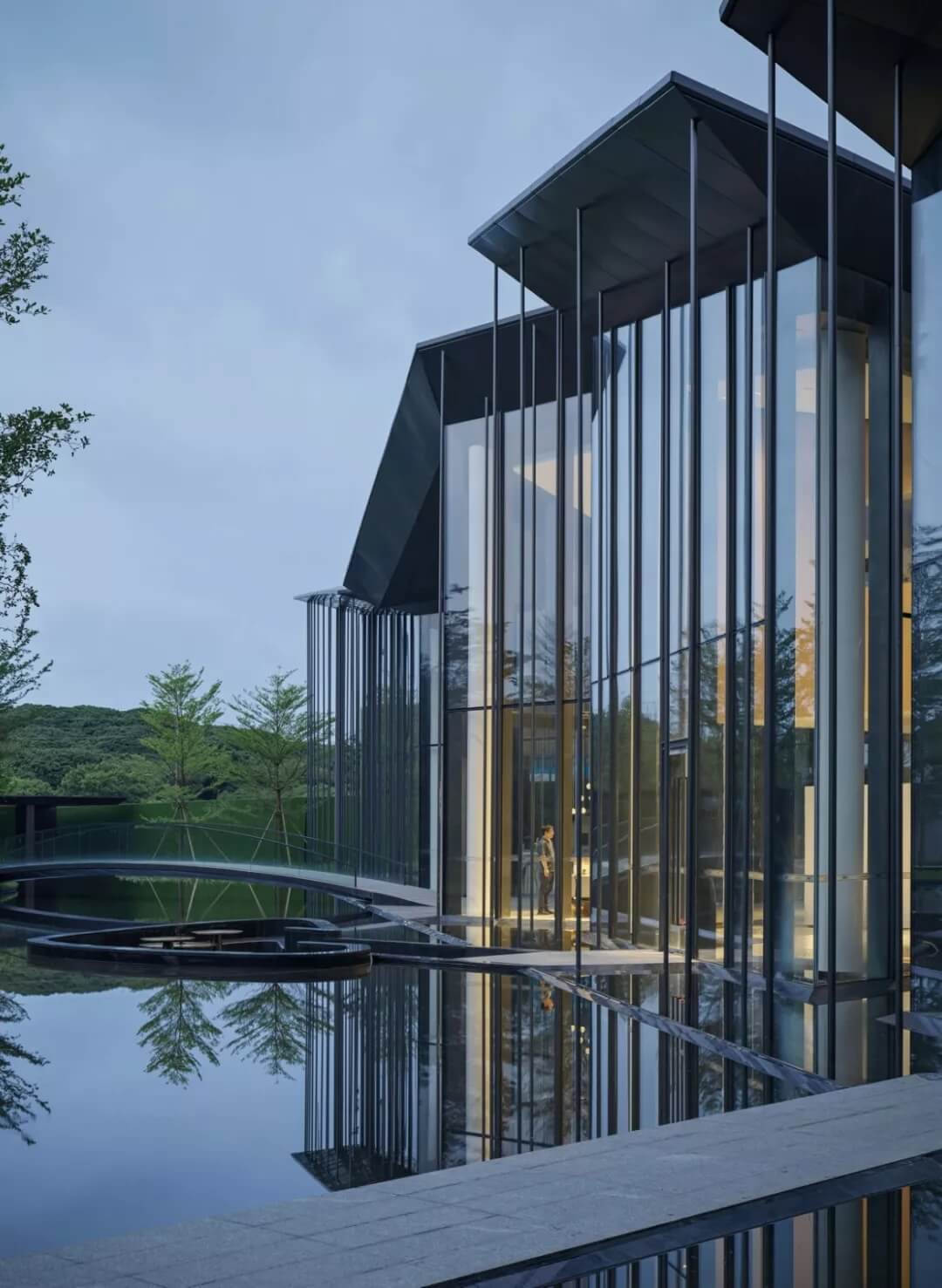 在這個(gè)項(xiàng)目中,建筑師嘗試用現(xiàn)代的理念、結(jié)構(gòu)和材料來(lái)打造由封閉走向開(kāi)放融合的客家建筑,創(chuàng)造出傳統(tǒng)文化和現(xiàn)代觀念相結(jié)合的建筑形態(tài)。如同客家建筑大多坐落于山水樹(shù)林間,這座雙層建筑與周?chē)匀痪坝^也保持著親密聯(lián)系。剪影式的三角形頂棚如同山的影子般遮蓋著地面;而支撐著整個(gè)三角屋頂?shù)慕饘僦韧鹑裘艿臉?shù)林,與戶(hù)外的樹(shù)木連成一片;環(huán)繞場(chǎng)地的水景弱化了由剛性的幾何平面帶來(lái)的疏離感,大面積的玻璃的應(yīng)用,引入周?chē)G色景觀,重新定義了建筑與周邊的環(huán)境關(guān)系。莊重但不厚重的頂棚,高聳錯(cuò)落的柱廊,通透的落地玻璃,山與樹(shù)與水。