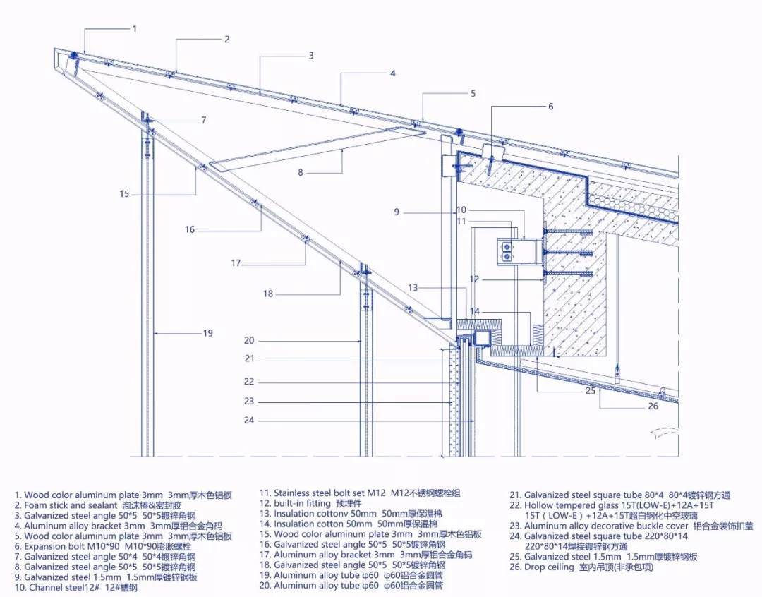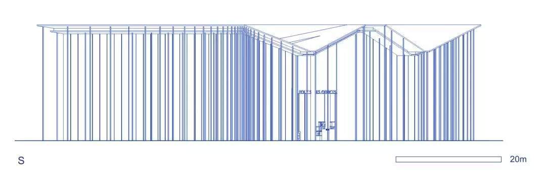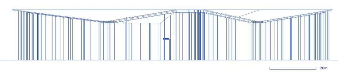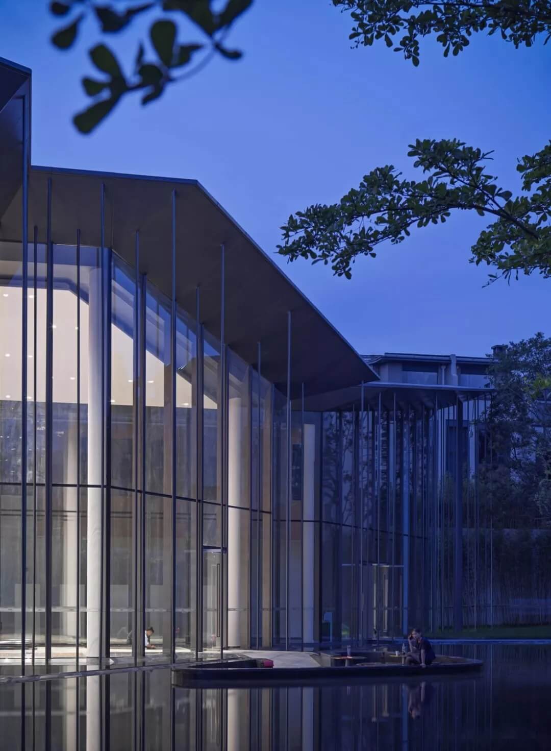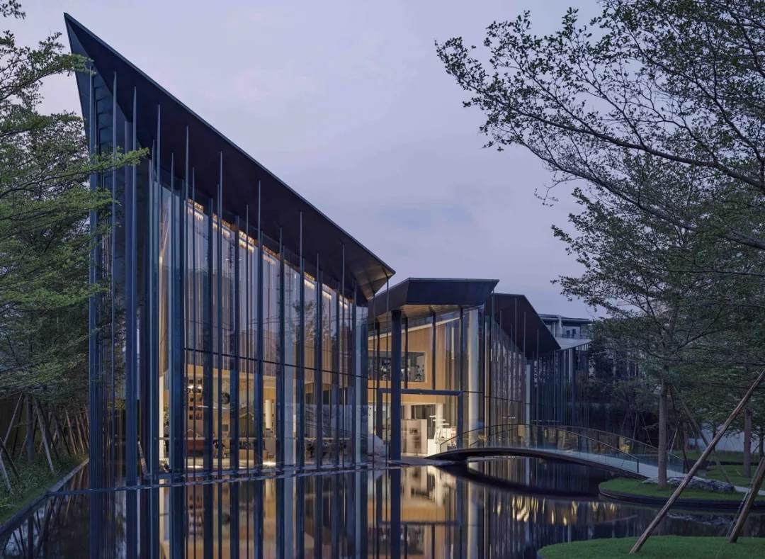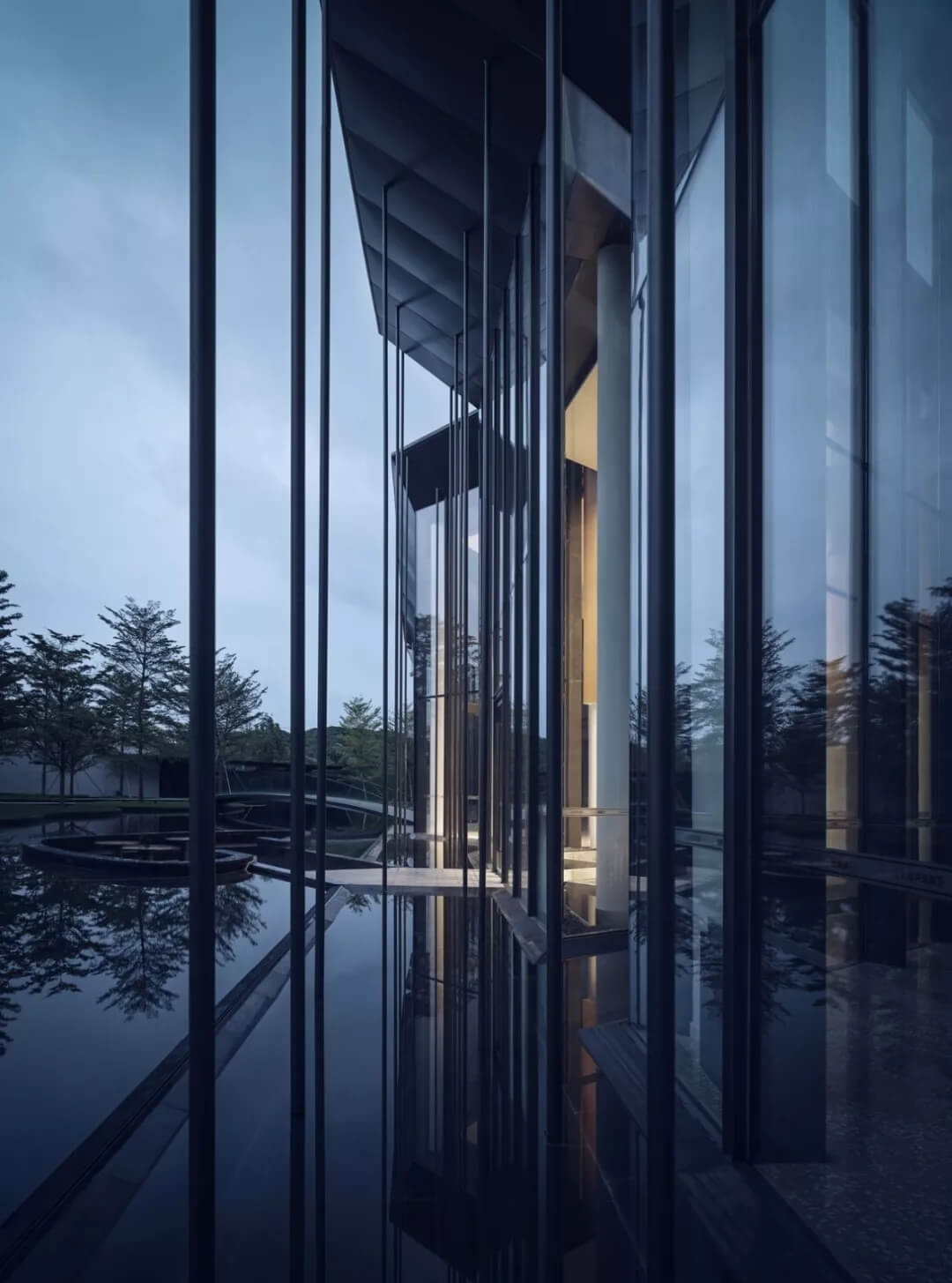 在這個(gè)項(xiàng)目中,建筑師嘗試用現(xiàn)代的理念、結(jié)構(gòu)和材料來(lái)打造由封閉走向開(kāi)放融合的客家建筑,創(chuàng)造出傳統(tǒng)文化和現(xiàn)代觀念相結(jié)合的建筑形態(tài)。如同客家建筑大多坐落于山水樹(shù)林間,這座雙層建筑與周?chē)匀痪坝^也保持著親密聯(lián)系。剪影式的三角形頂棚如同山的影子般遮蓋著地面;而支撐著整個(gè)三角屋頂?shù)慕饘僦韧鹑裘艿臉?shù)林,與戶(hù)外的樹(shù)木連成一片;環(huán)繞場(chǎng)地的水景弱化了由剛性的幾何平面帶來(lái)的疏離感,大面積的玻璃的應(yīng)用,引入周?chē)G色景觀,重新定義了建筑與周邊的環(huán)境關(guān)系。莊重但不厚重的頂棚,高聳錯(cuò)落的柱廊,通透的落地玻璃,山與樹(shù)與水。