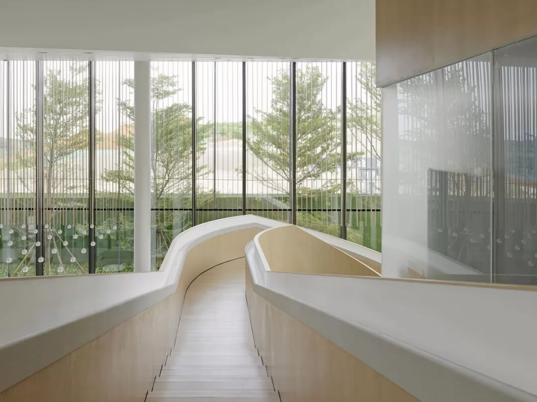 在直線構(gòu)成的空間中,設(shè)計(jì)師巧妙地設(shè)置了一個(gè)旋轉(zhuǎn)樓梯,經(jīng)過(guò)鋼結(jié)構(gòu)精確的計(jì)算,運(yùn)用了非柱支撐的結(jié)構(gòu)連接于兩層間。游客可以通過(guò)此旋轉(zhuǎn)樓梯到達(dá)二樓的貴賓室和辦公室,透過(guò)具有框景效果房間窗戶(hù)向外望出,看到室內(nèi)各部的同時(shí)亦可以觀賞周邊風(fēng)景。