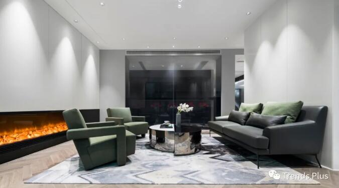 翡翠林梢青黛山,碧紗窗外水挪藍(lán),淺色的空間融入灰綠色的軟裝,建筑與室內(nèi)的氣質(zhì)彌漫開來(lái)。定制的麂皮絨沙發(fā),鏡面金屬和白色石材拼接而成的茶幾,藝術(shù)感彰顯無(wú)遺。黑色漸變玻璃隔墻,既是背景墻又是空間顏色最深的立面,讓茶水間在保持通透的同時(shí)又保證會(huì)客區(qū)客人的私密性。壁爐,火焰,回歸自然的同時(shí)讓氛圍變得輕緩,香茗與咖啡,讓辦公空間散發(fā)著靈魂的香氣。