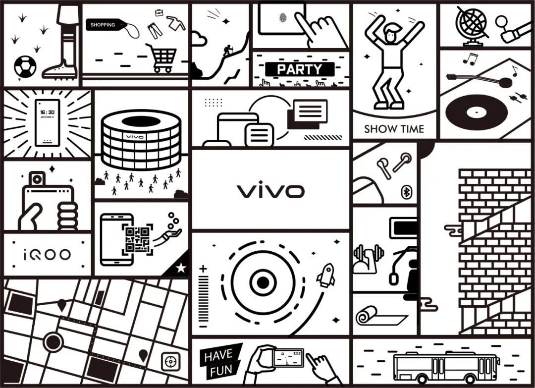 咖啡廳翻轉(zhuǎn)板設(shè)計的插畫,由vivo手機不同的使用場景組成,傳達品牌精神。