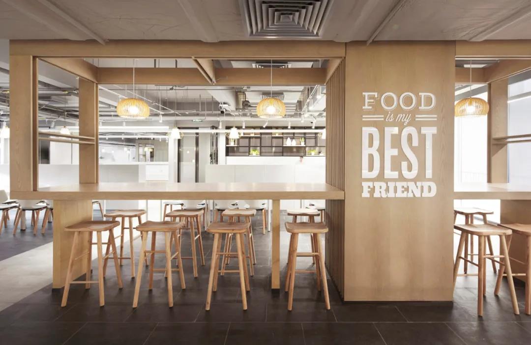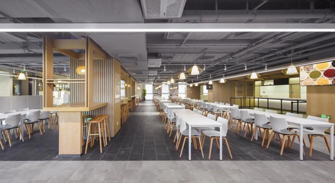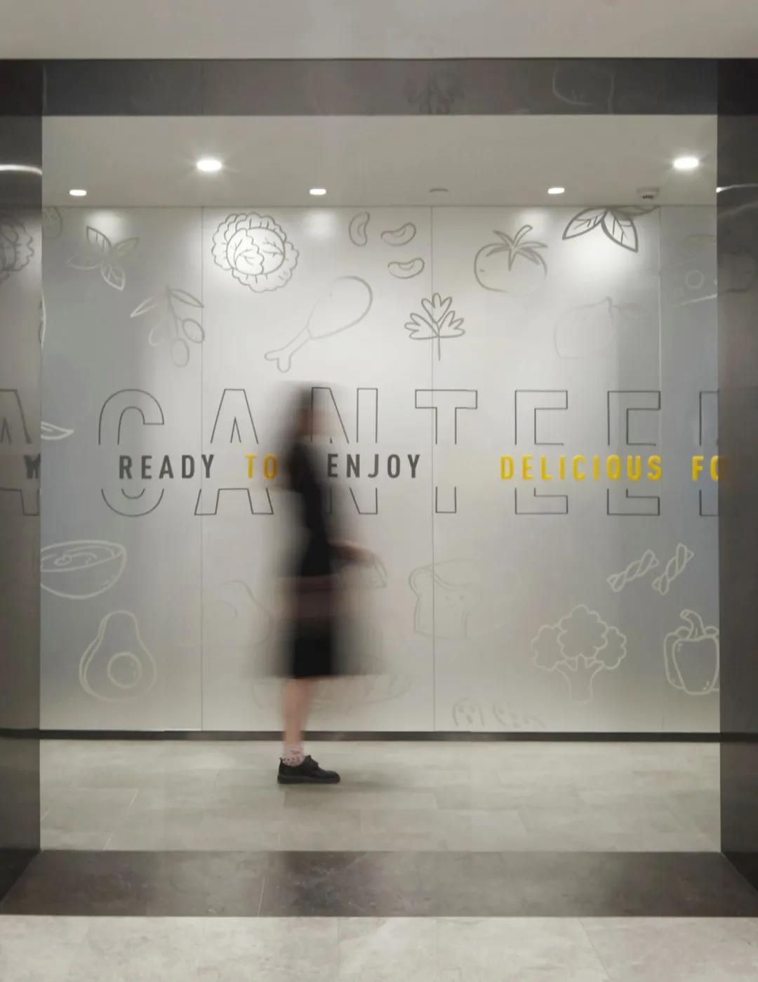 不同于其他辦公樓餐廳布置在地下層,vivo以三層作為生活服務(wù)區(qū),集中布局健身和餐廳,方便管理并對其他辦公層影響較少。餐廳入口使用磨砂鏡彩繪圖案,指示清晰,內(nèi)部通過地面鋪磚、桌椅組擺等方式設(shè)置出等候,取餐,就餐,收盤等交通動線,維護空間秩序,營造出輕松舒適整潔的就餐環(huán)境。