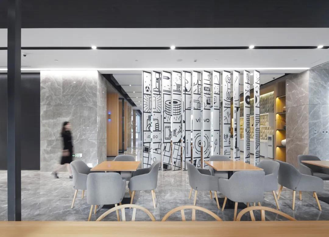 大堂作為整體的對外開放和形象展示空間,配備了咖啡,休閑茶水,展廳,洽談,會議等開放的功能性空間,配以圖像視覺傳達設(shè)計,軟植入vivo品牌精神。