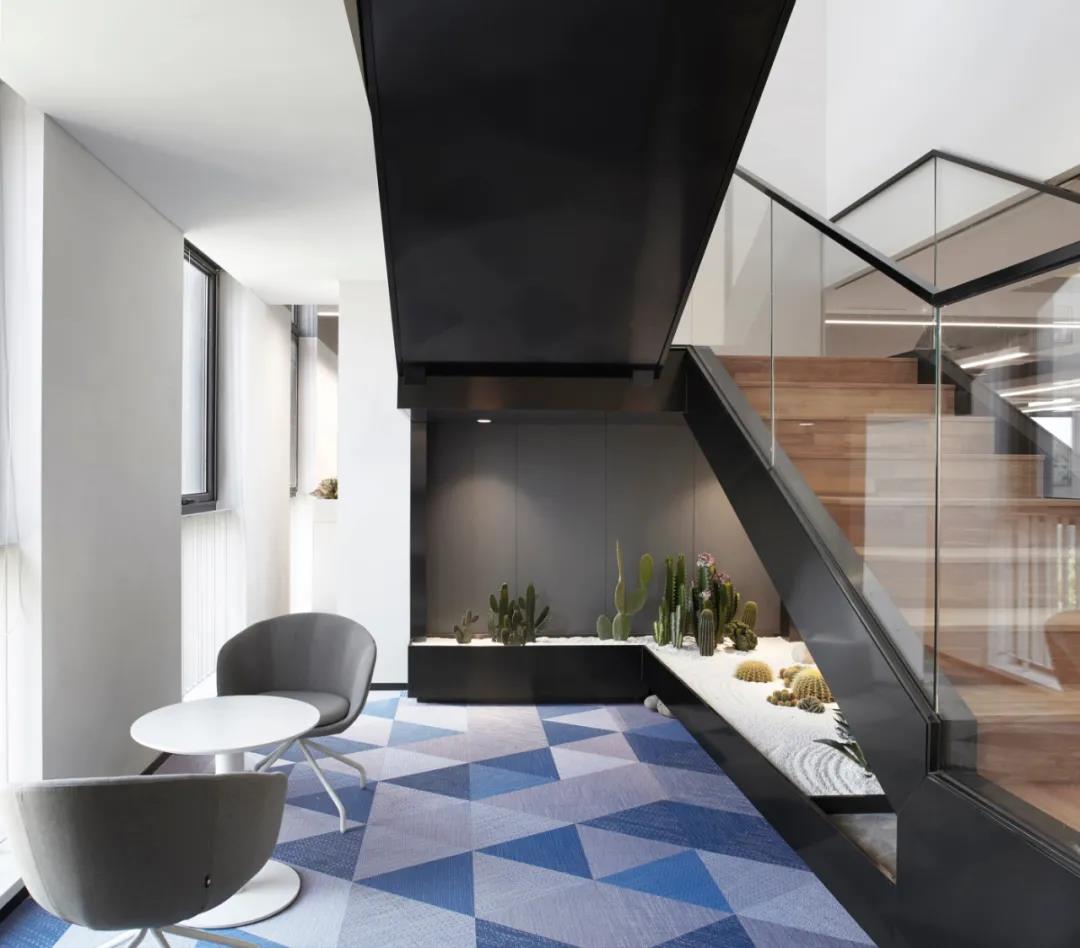 東側(cè)靠窗,面向花園的一面,布置休閑茶水區(qū),并打通部分樓層樓板,設(shè)步梯,促進各部門之間交流,開展多場景辦公。