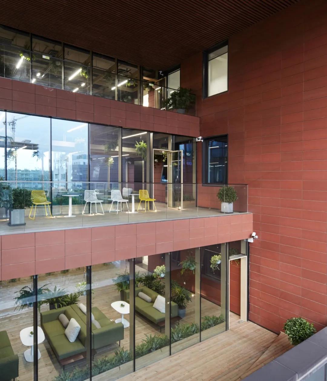 在建筑中段的4-6層,是一處半室外的連橋空間。通過結(jié)構(gòu)適度改造營建了三個疊落的空中花房,同時每個花房都配有戶外露臺作為空間延展。矩陣型木質(zhì)天花延伸到側(cè)墻并落地,地面鋪防腐木條,整個空間配備綠植,營造輕松、生態(tài)的戶內(nèi)外休憩空間,同時還可作為研討,舉辦小型活動的多功能空間使用。