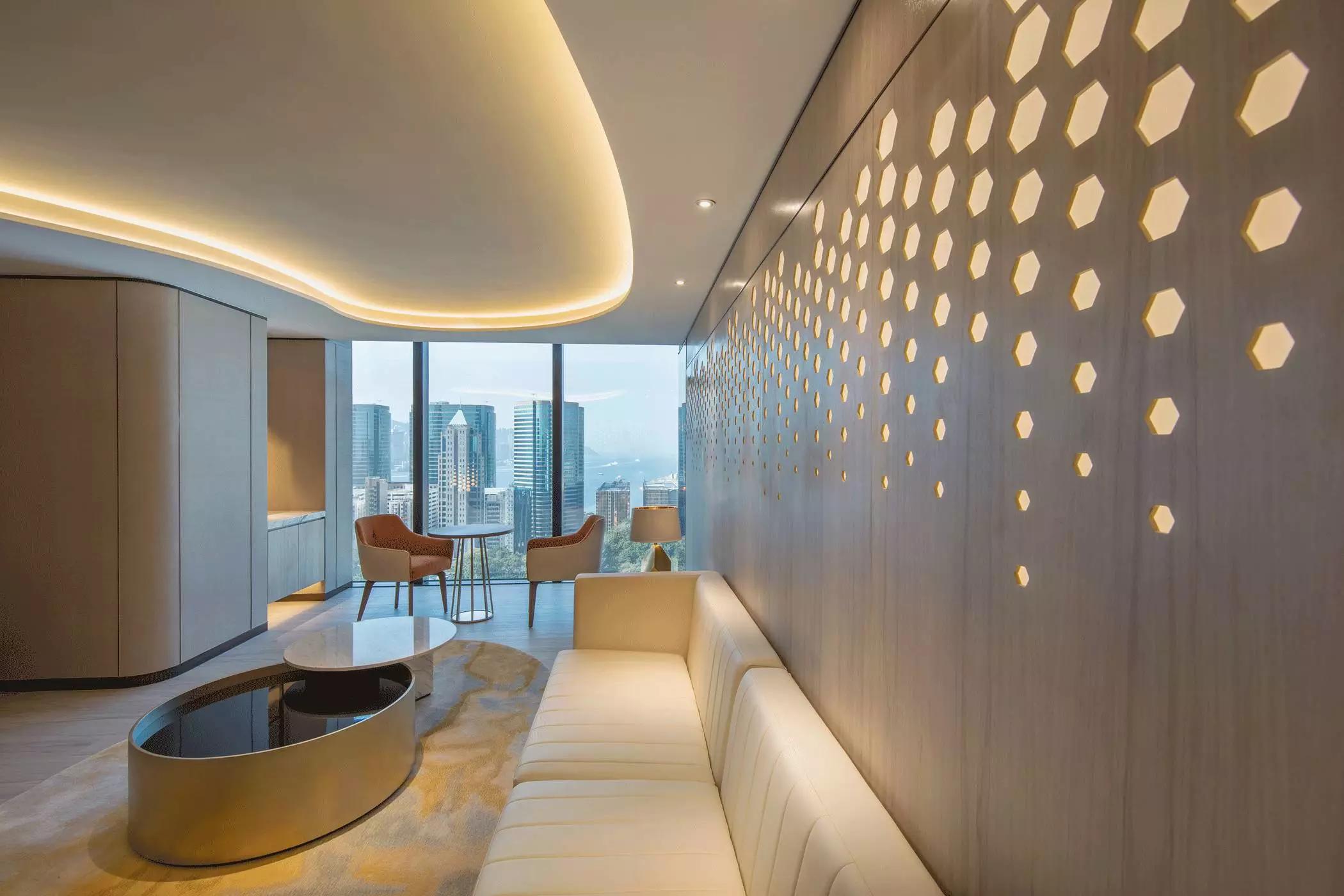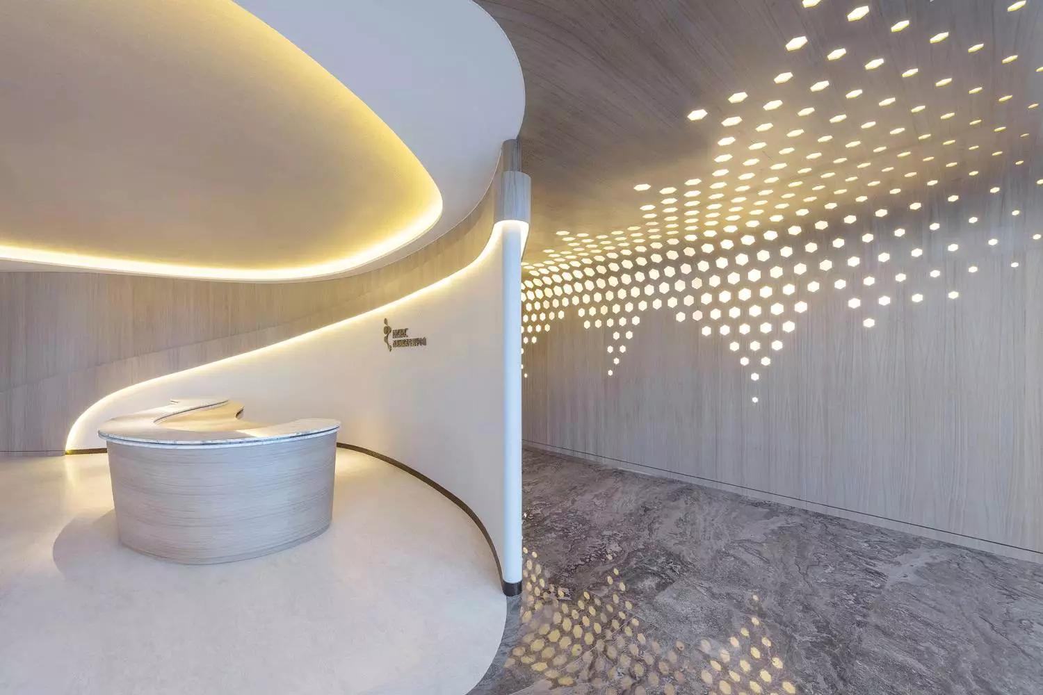 蜂窩形狀滲進(jìn)天花至墻身的燈箱以及屏風(fēng),體現(xiàn)出大自然的親和力讓人心沈靜,宛若森林小徑,葉縫間穿過(guò)而灑落的陽(yáng)光,體現(xiàn)日本韻文中的「Komorebi」靜謐而悠閑涵蘊(yùn)希望。