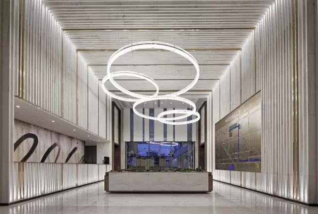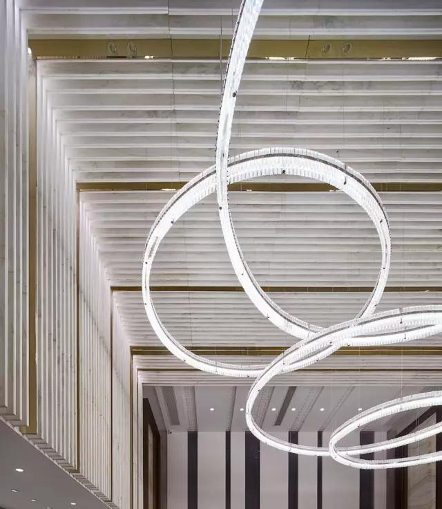 天花和墻體以犀牛白大理石片狀方式陣列,石材與石材之間加入香檳色鏡面不銹鋼做為分隔,巧妙地渲染了空間的尊貴價(jià)值感,也很好地提升了視覺的立體感。